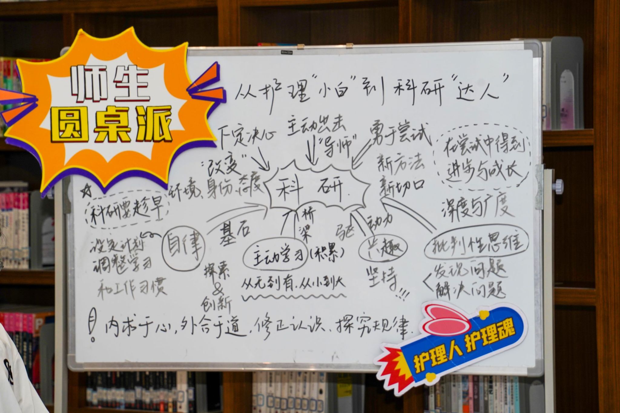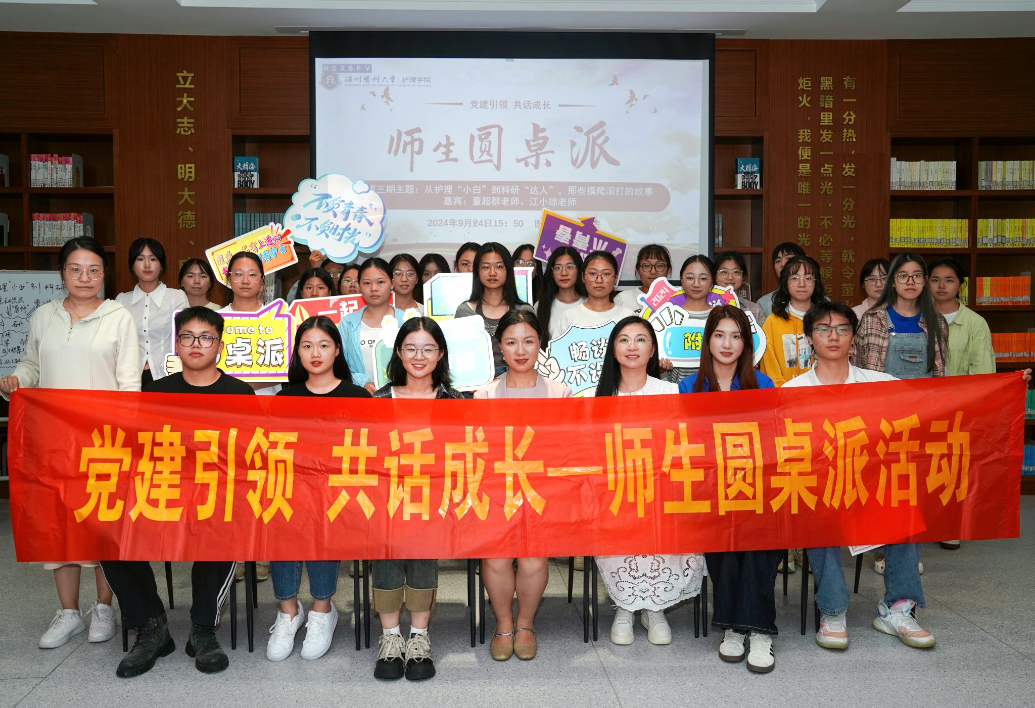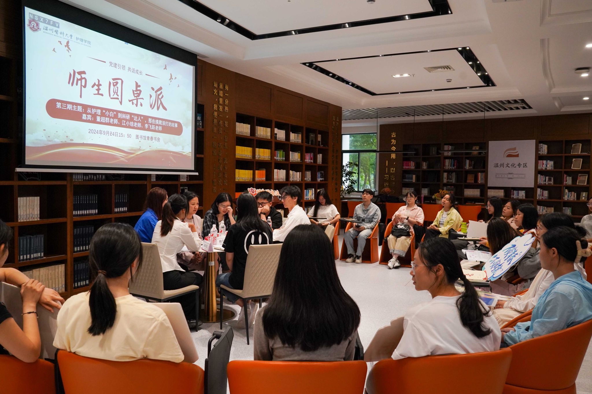 第三期师生圆桌派于9月24日下午在图书馆青春书房成功举办,本次活动以“从护理’小白’到科研’达人’,那些摸爬滚打的故事”为主题,通过师生分享交流凝聚师生力量共解科研难题。本次活动嘉宾为成人导航 副院长董超群、成人导航 教师江小琼、李飞跃老师,研究生代表傅莹洁、梁成龙,和本科生代表邓奕晗同学,现场观众由部分学生党员、入党积极分子代表及线上2024级大一新生组成。