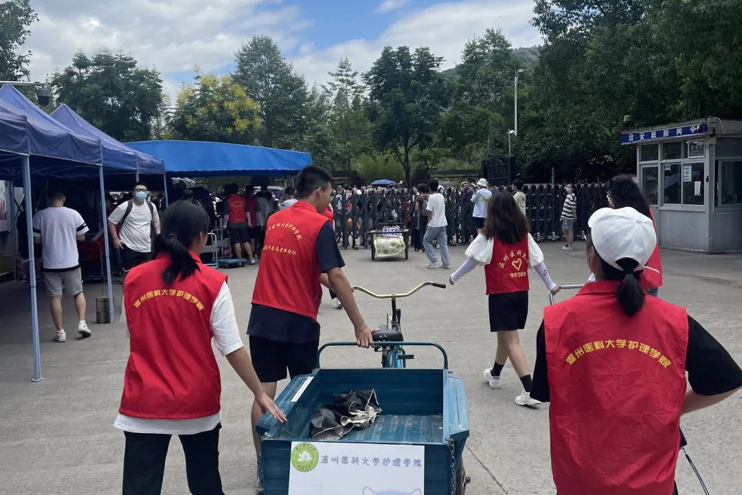 在服务点提供爱心三轮车,帮助护理新生搬运行李、物资等,每一次耐心指引,每一次侧耳倾听,每一次微笑回应,都传达着来自学长学姐们的欢迎与温暖。