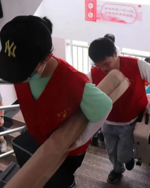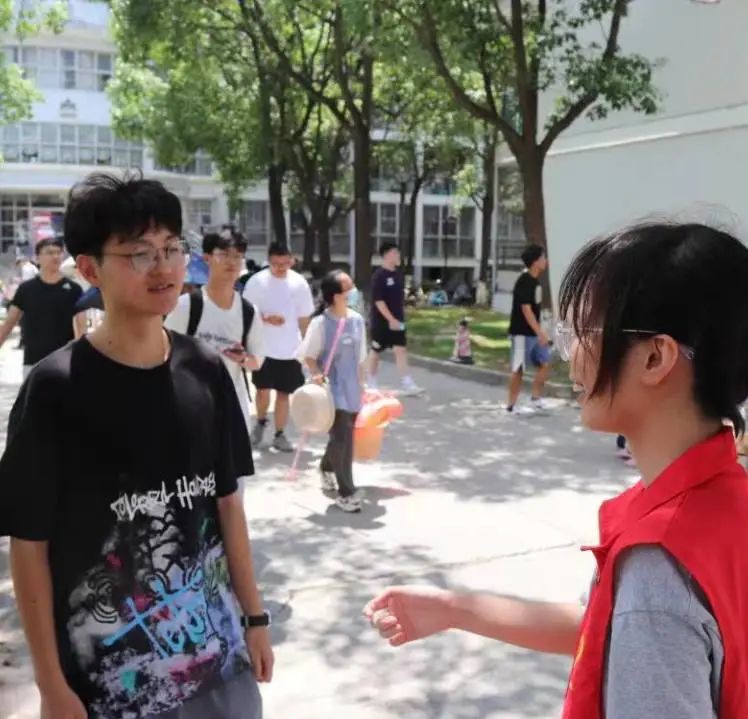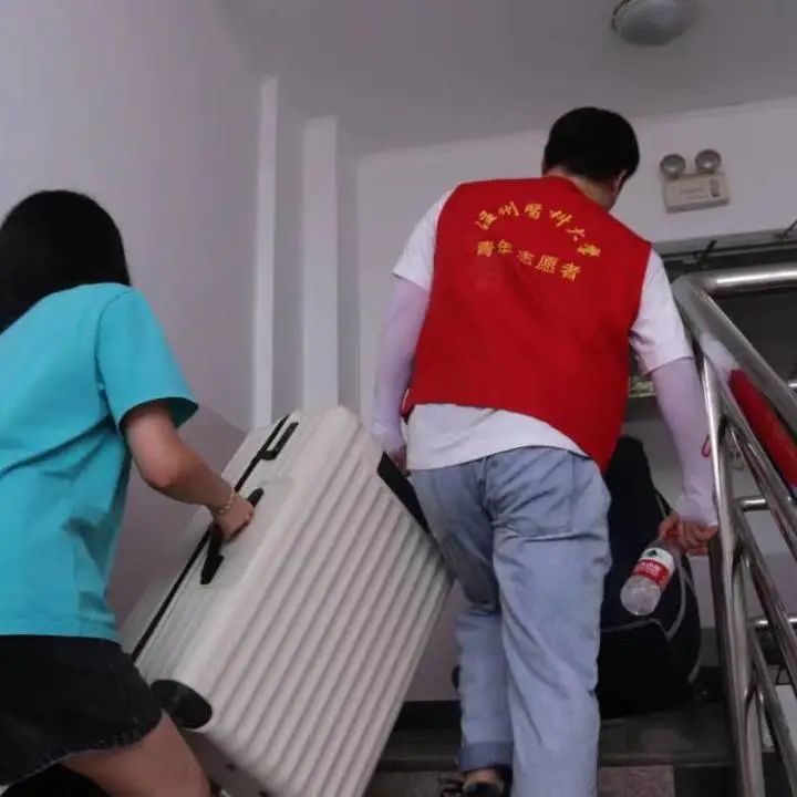 老师和学院白鸽青年志愿者服务社的志愿者,身着统一服装以饱满的热情投入到迎新工作中,他们在宿舍和大门之间往返,接过萌新们手上重重的行李,以最热情饱满的态度为新生指引方向。