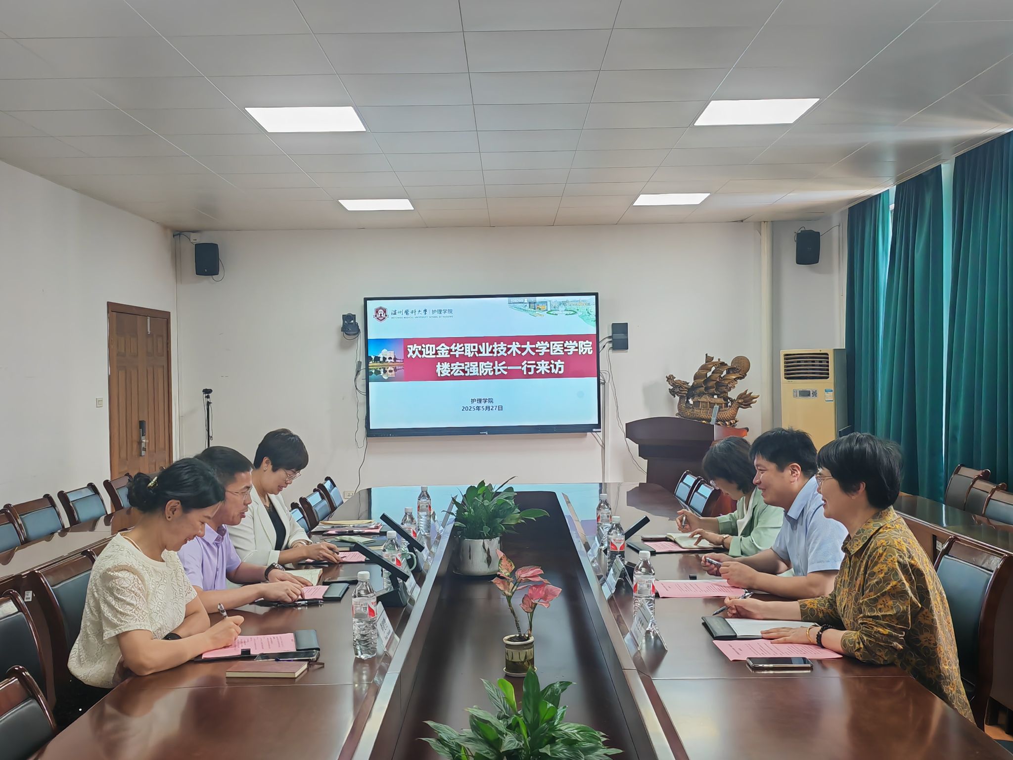 5月27日上午,金华职业技术大学医学院楼宏强院长一行到成人导航 访问交流。成人导航 院长蔡福满、副院长黄小琼、副院长董超群及教学办参加会议。