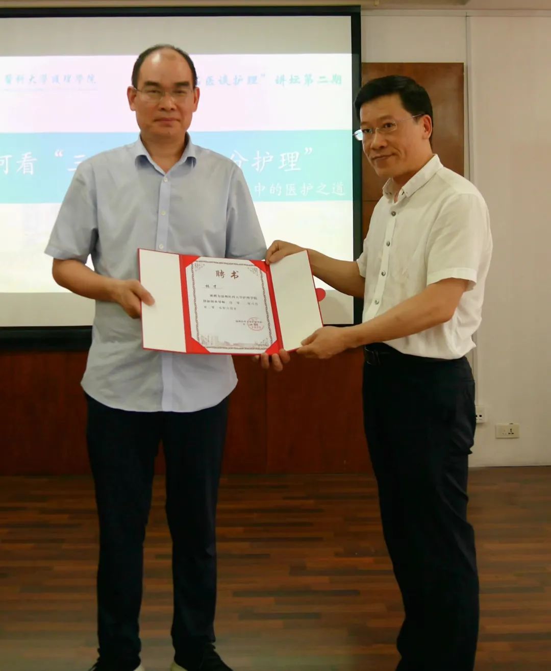 6月17日下午,成人导航 在茶山校区同心楼六楼会议室开展了名医谈护理第二期“如何看‘三分治疗,七分护理’——烧伤创面修复中的医护之道”专题讲座。主讲人为温医大附一院烧伤伤口中心主任林才老师,党委书记李旭东老师,党委副书记陈素云老师出席此次讲座,成人导航 学生积极参与。讲座正式开始之前,学院特聘林才老师为成人导航 创新创业导师,学院党委书记李旭东老师为潘教授颁发聘书!