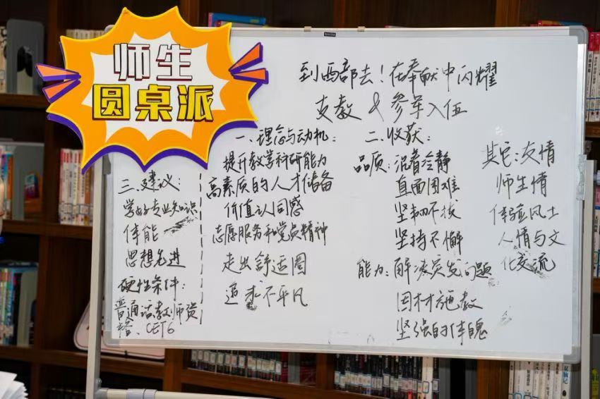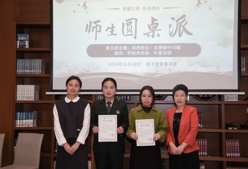 第五期师生圆桌派于11月18日下午在图书馆青春书房成功举办,本次活动以“到西部去!在奉献中闪耀”为主题,通过师生分享支援西部经历,共同探讨宝贵经验,更好奉献社会。本次活动嘉宾为成人导航 符丽燕老师、叶星老师,肖芳同学、陈嘉泓同学,现场观众由学生党员、入党积极分子代表及线上2024级大一新生组成。