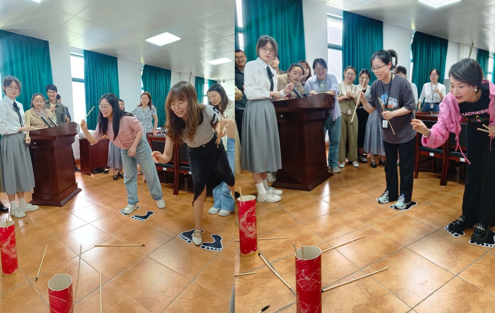 趣味投壶环节,老师们瞄准壶桶,找好角度,手起箭落,讲究一个又快又准,时而开怀大笑,时而屏息凝神。精彩刺激的投壶放松了身心、增进了感情,更体验了传统文化。