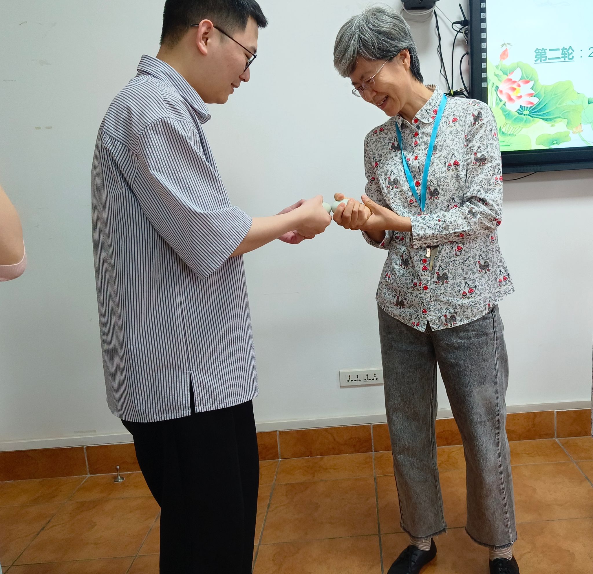 童趣撞蛋环节,老师们各自挑选出自己心仪的鸭蛋,两两PK,获胜者进入下一轮。老师们神态各异,有的兴奋,有的紧张,有的期待,在欢声笑语中,每一小组的“蛋王”纷纷诞生。