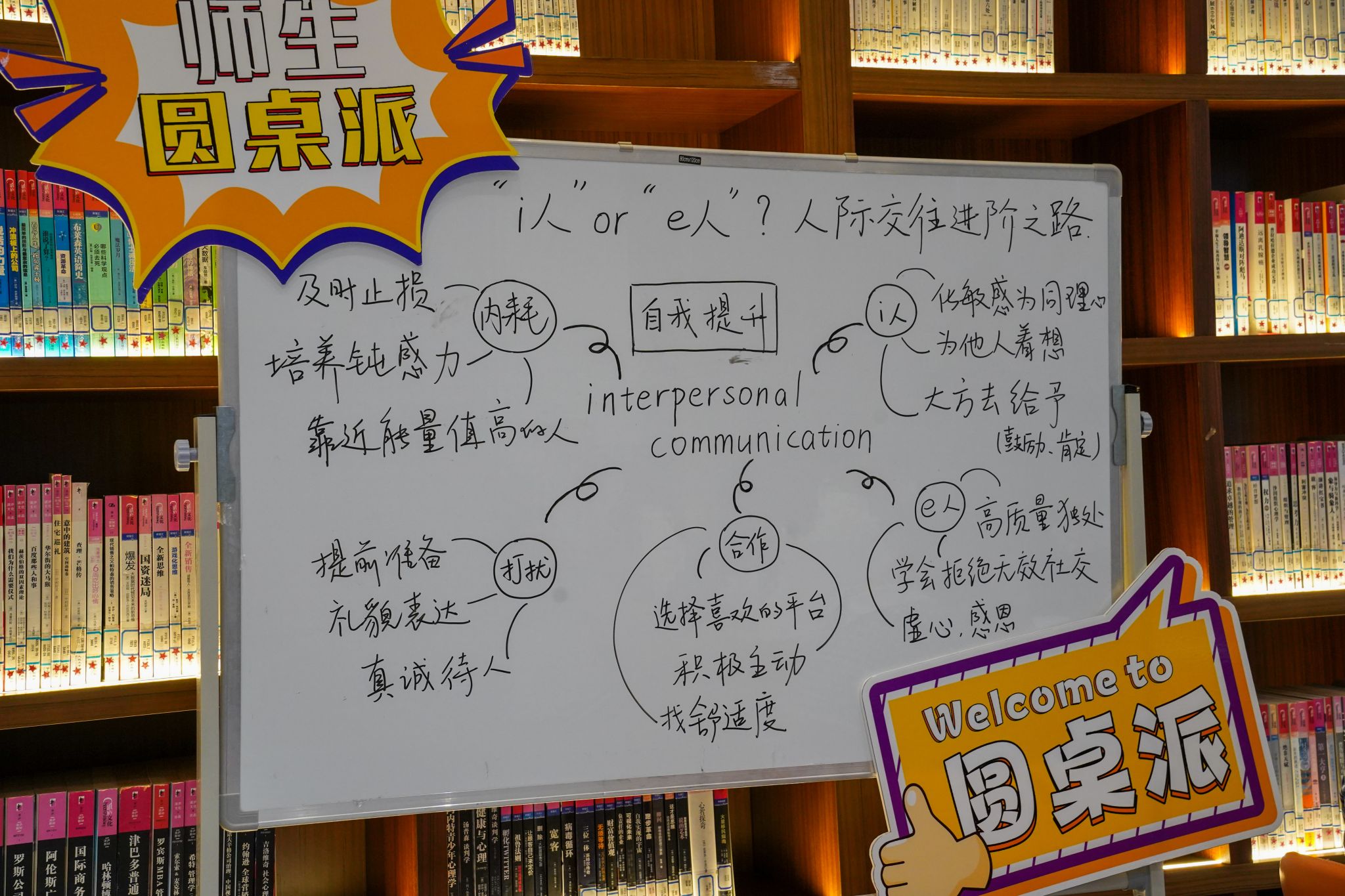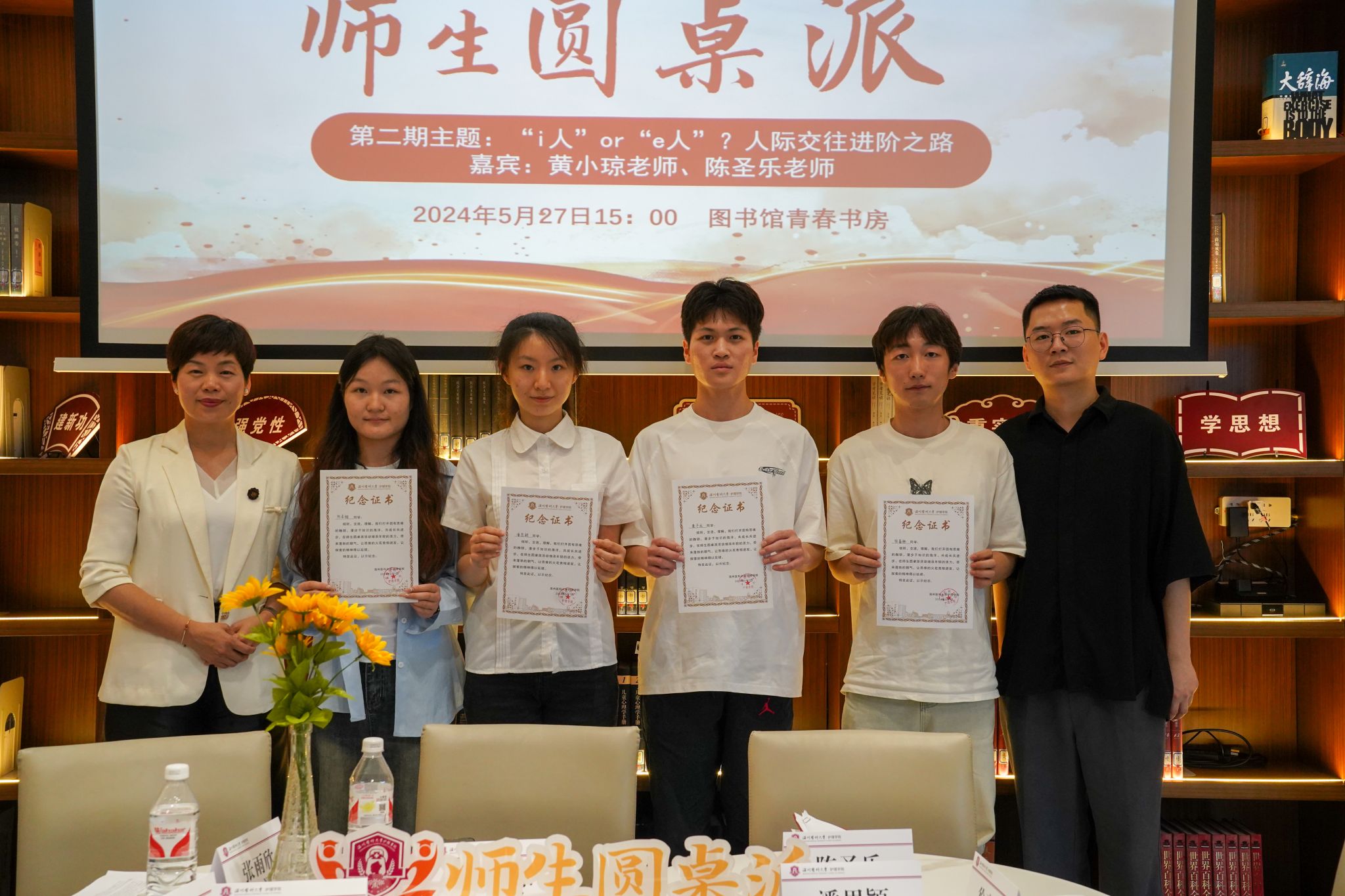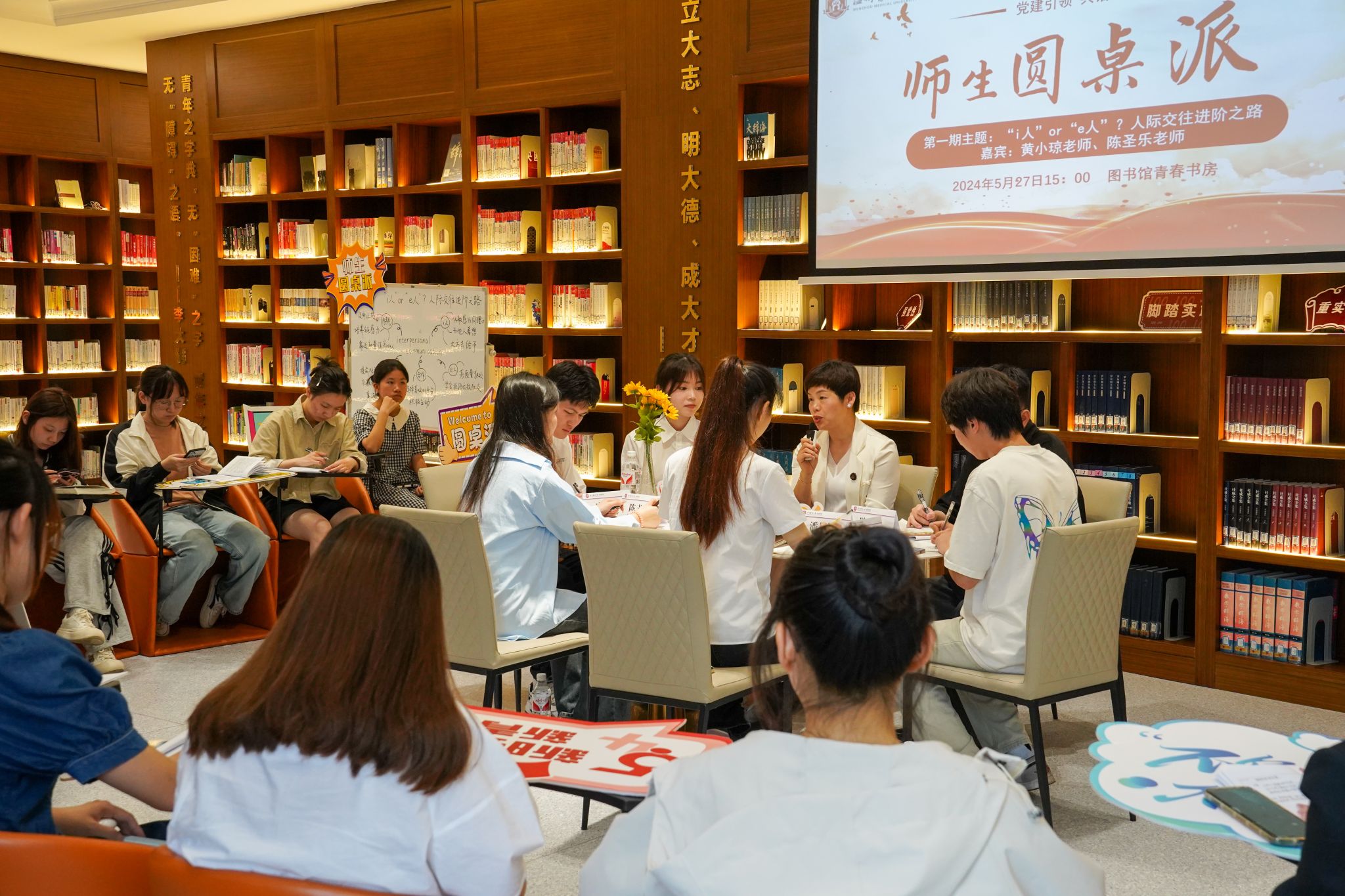 第二期师生圆桌派于5月27日下午在图书馆青春书房成功举办,本次活动以“‘i人’or ‘e人’?人际交往进阶之路”为主题,通过师生分享交流,凝聚师生力量共解人际交往难题。本期活动嘉宾为教师党员副院长黄小琼老师和辅导员陈圣乐老师,部分学生党员及入党积极分子代表参与其中。