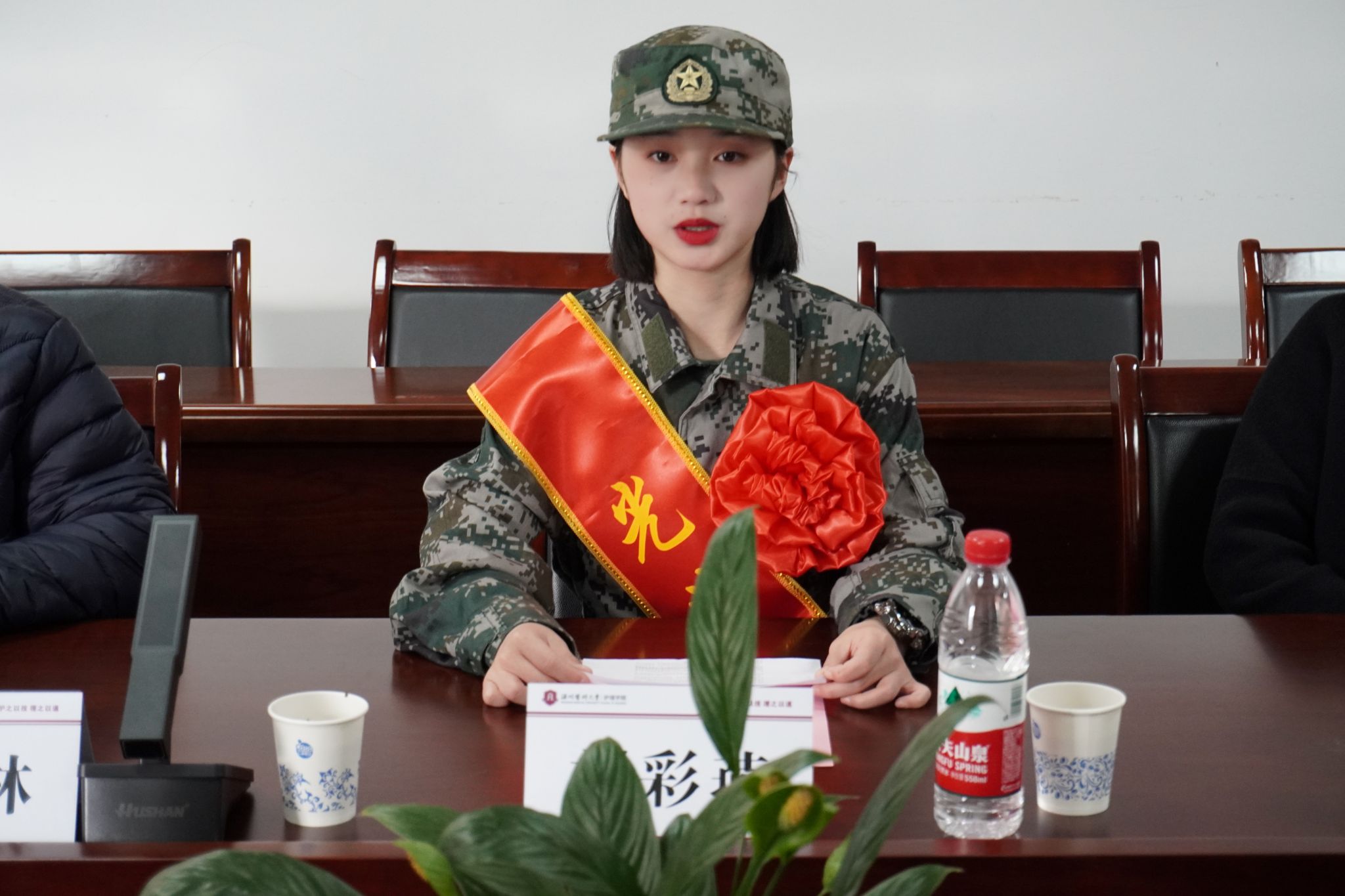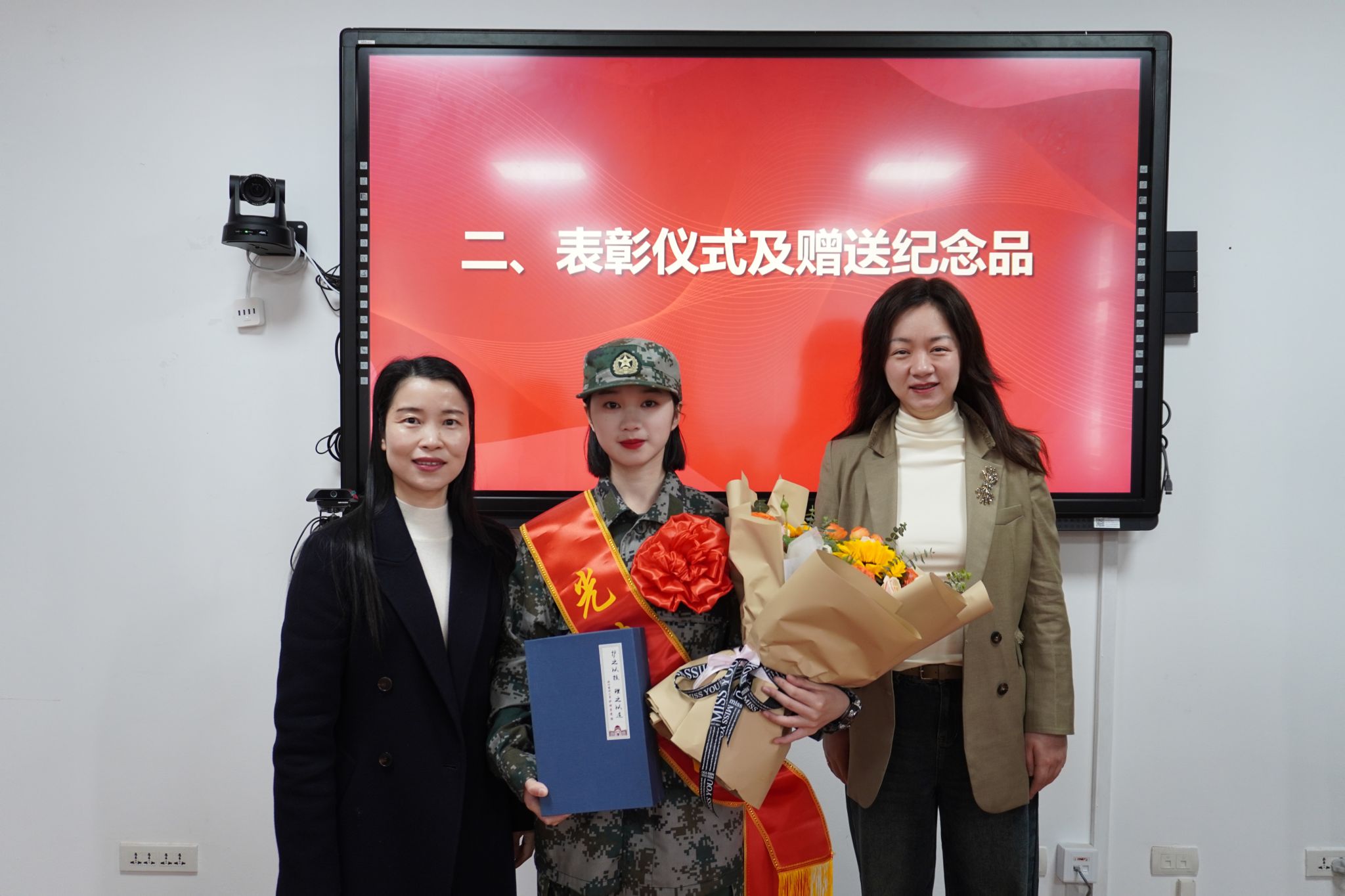 随后进行表彰仪式。由王敏书记和金晓童副书记为刘彩燕佩戴“光荣入伍”的绶带和象征着荣誉的大红花,送上学院定制纪念品并表示热烈的祝贺。