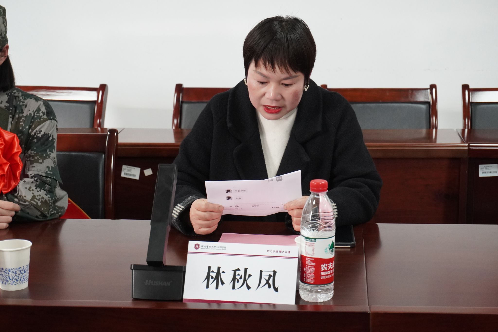 最后,学院党委书记王敏发表讲话。她代表学院向刘彩燕同学表示热烈的祝贺,向支持国防建设,舍小家的刘彩燕父母致以崇高的敬意。她向即将踏上军旅征程的刘彩燕同学提出几点希望:第一,珍惜荣誉,牢记使命,强化理想信念,努力成为一名政治合格,立场坚定,素质突出的士兵;第二,不畏艰苦,锤炼本领,对自己高标准,严要求,实现从校门到营门的跨越,在强军中成长成才;第三,建功立业,不负韶华,把温医人的精神特质融入军旅舞台,争当模范标兵,为学校为学院为父母争光,为国防现代化作出贡献。
