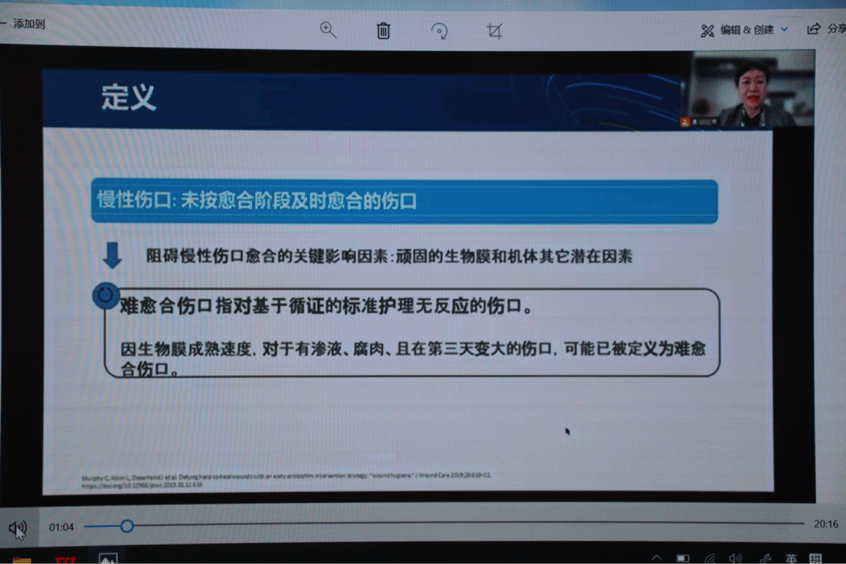 浙江大学医学院附属邵逸夫医院造口伤口专科护士长胡宏鸯通过线上视频做题为 《难愈合伤口生物膜干预策略:伤口卫生》的专题讲座。她对细菌生物膜定义的阐述让大家对难愈合伤口护理有了新的认识,意识到有规律、经常性进行伤口卫生是十分重要的,伤口卫生是伤口护理的基础,生物膜管理要与疾病管理同步进行,实施伤口卫生步骤所需的技能、材料和时间性价比高,可促进有效伤口愈合,降低社会医疗负担,减轻患者社会心理影响。