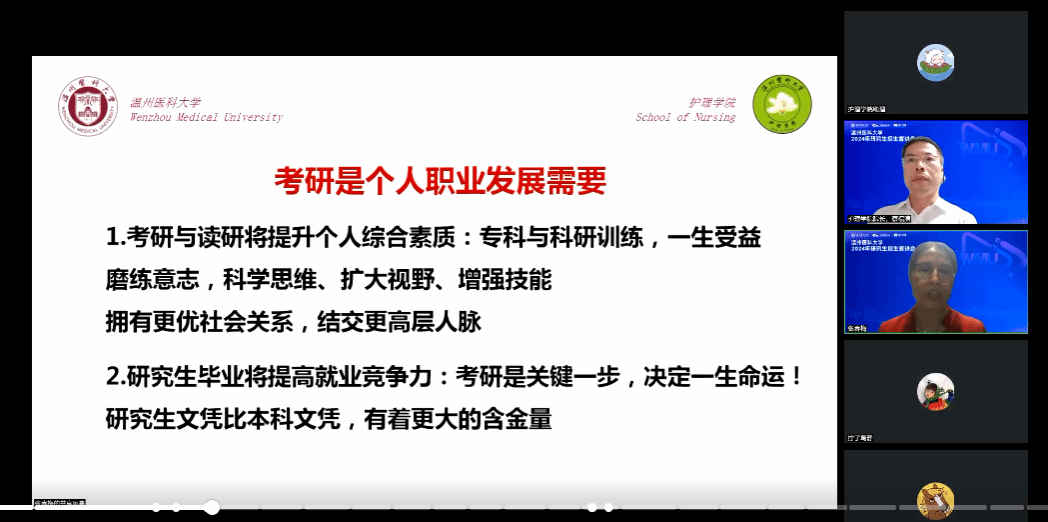 蔡福满对线上参加招生宣讲的同学表示诚挚的欢迎。张春梅介绍了成人导航 及成人导航 的校园文化、校园环境和发展历程,并对学科硕士点建设、师资队伍、研究生培养、科研成果及2024年护理学研究生招生情况进行讲解。