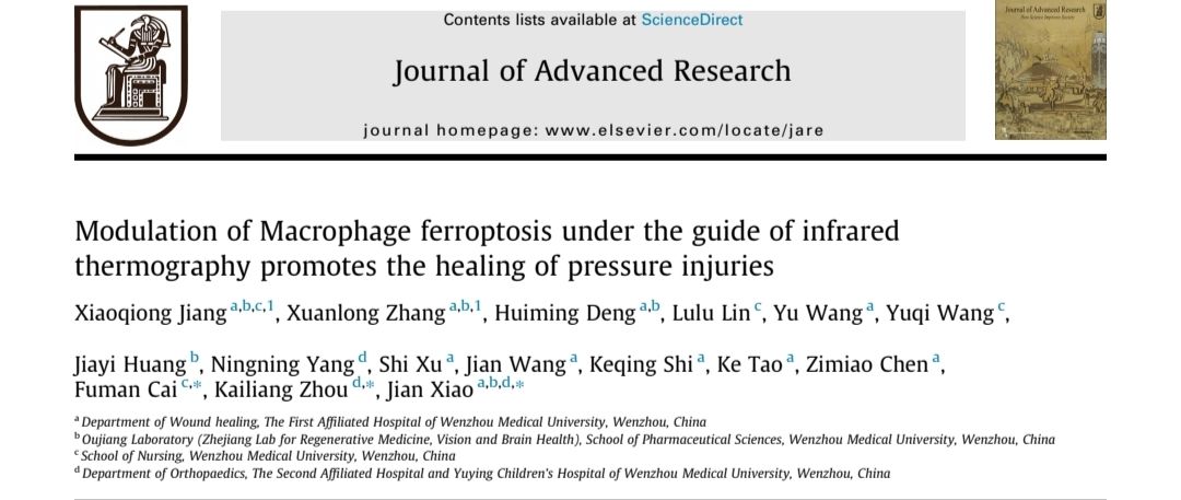 近日,成人导航 慢性伤口护理研究中心骨干成员江小琼在国际权威期刊《Journal of Advanced Research》(IF=11.4,综合性一区TOP)在线发表题为“Modulation of Macrophage Ferroptosis under the Guide of Infrared Thermography Promotes the Healing of Pressure Injuries”的论著。该研究揭示了压力性损伤修复过程中温度动态变化的新机制,并基于此提出一种可临床转化及居家应用的护理干预策略,为压力性损伤的精准护理干预提供了新范式。