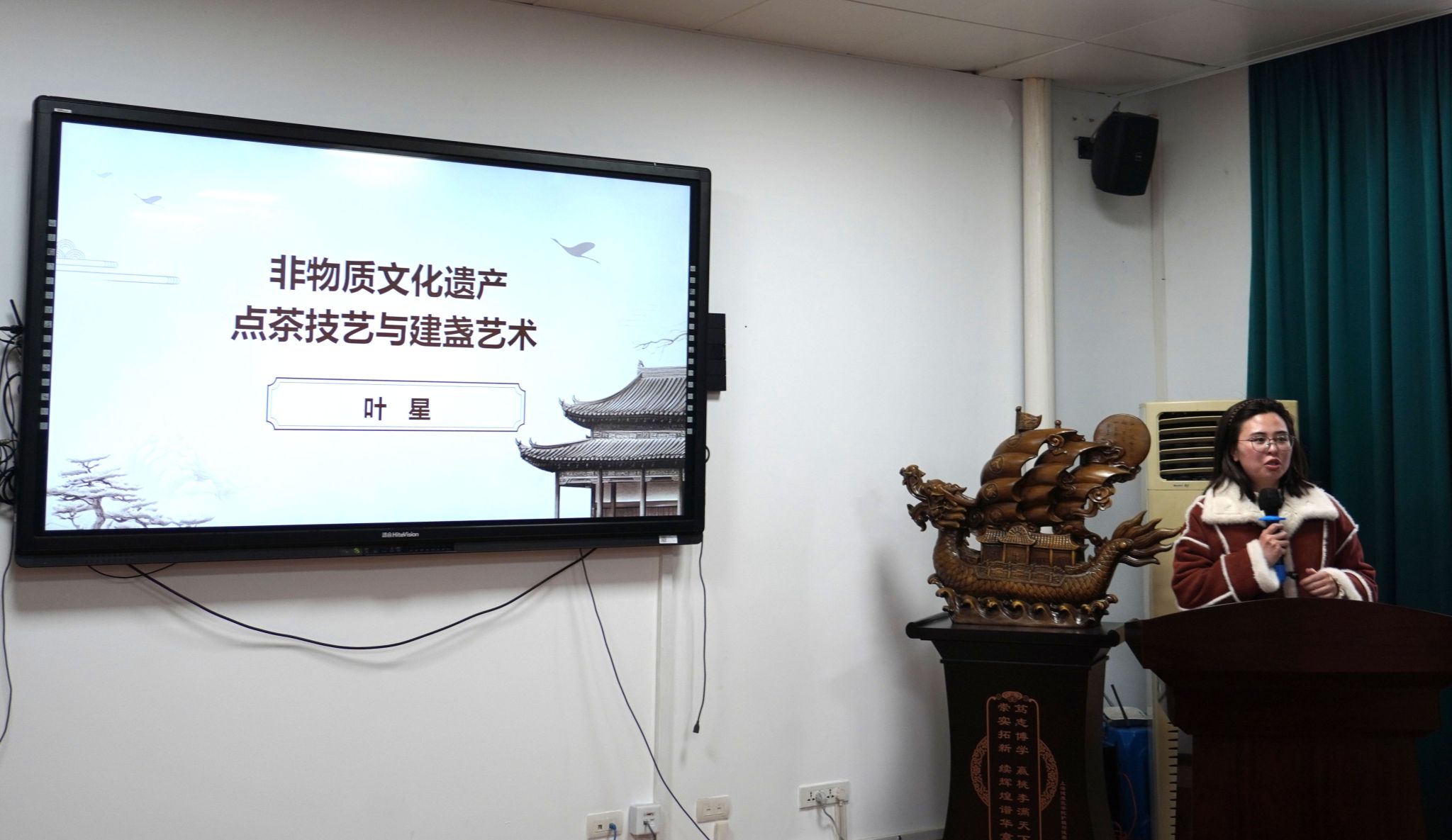 讲坛伊始,叶星老师分享了《非物质文化遗产:点茶技艺与建盏艺术》,她深入浅出地讲解了点茶技艺的起源与发展,探讨了点茶与建盏的完美结合,并从建盏的历史渊源、制作工艺到现代传承等多个方面对建盏进行了详细介绍。最后,现场还设置了扫码抽奖环节,将活动氛围推向高潮,老师们在轻松愉快的氛围中感受到了传统文化的独特魅力。