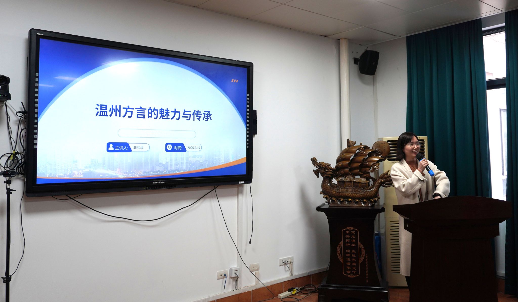 高晨晨老师分享了《温州方言的魅力与传承》,她从温州方言的属系源流讲起,详细阐述了温州方言在汉语方言体系中的独特地位。她深入分析了温州话的发音特点,通过生动的语音示范,让听众领略到温州方言的音韵之美。此外,高老师还结合温州俗语、地方轶事以及温州方言歌曲,展示了温州方言在民间文化中的深厚根基。她呼吁大家关注温州方言的使用现状,探讨了传承和保护地方方言的重要性。