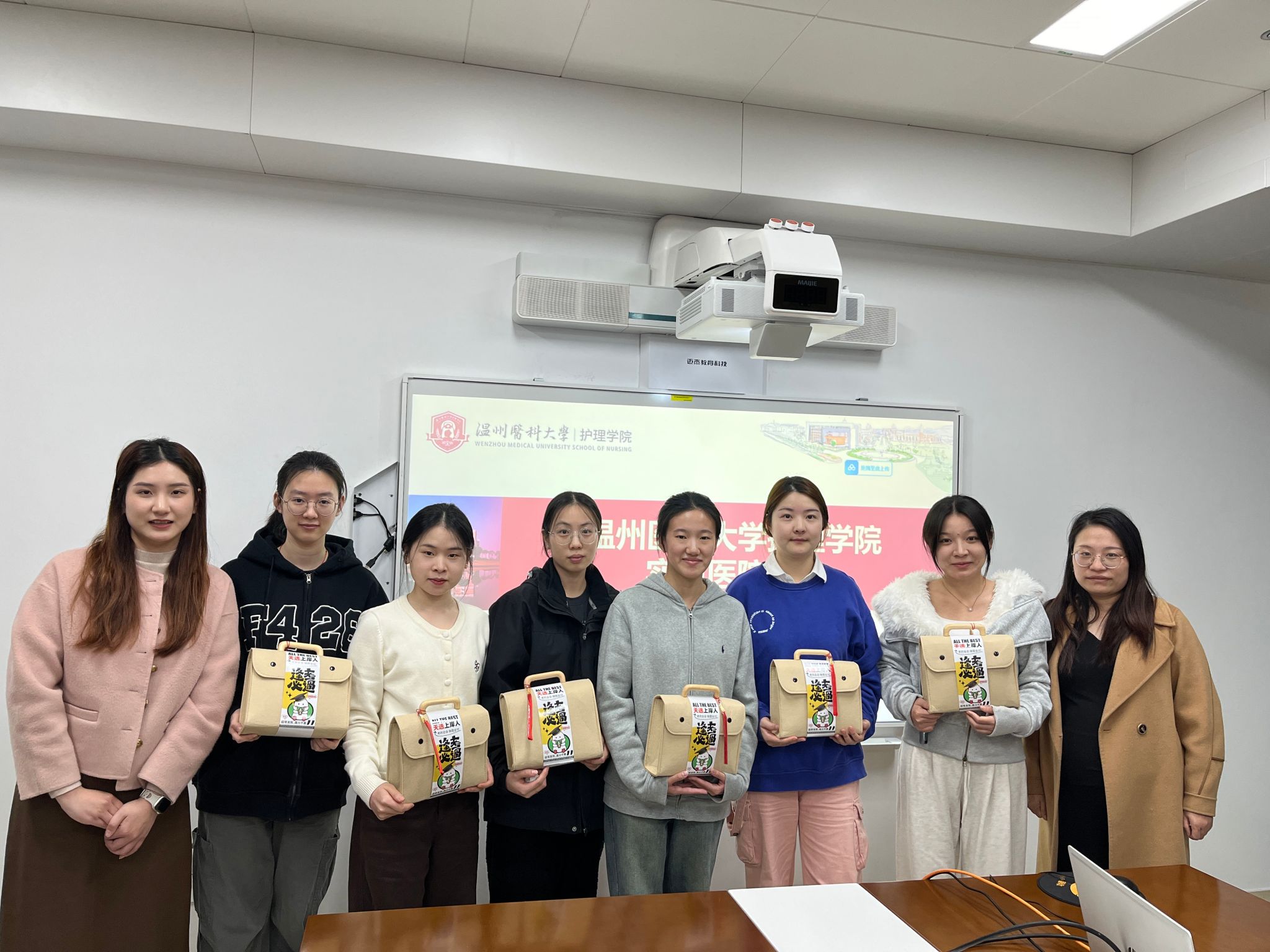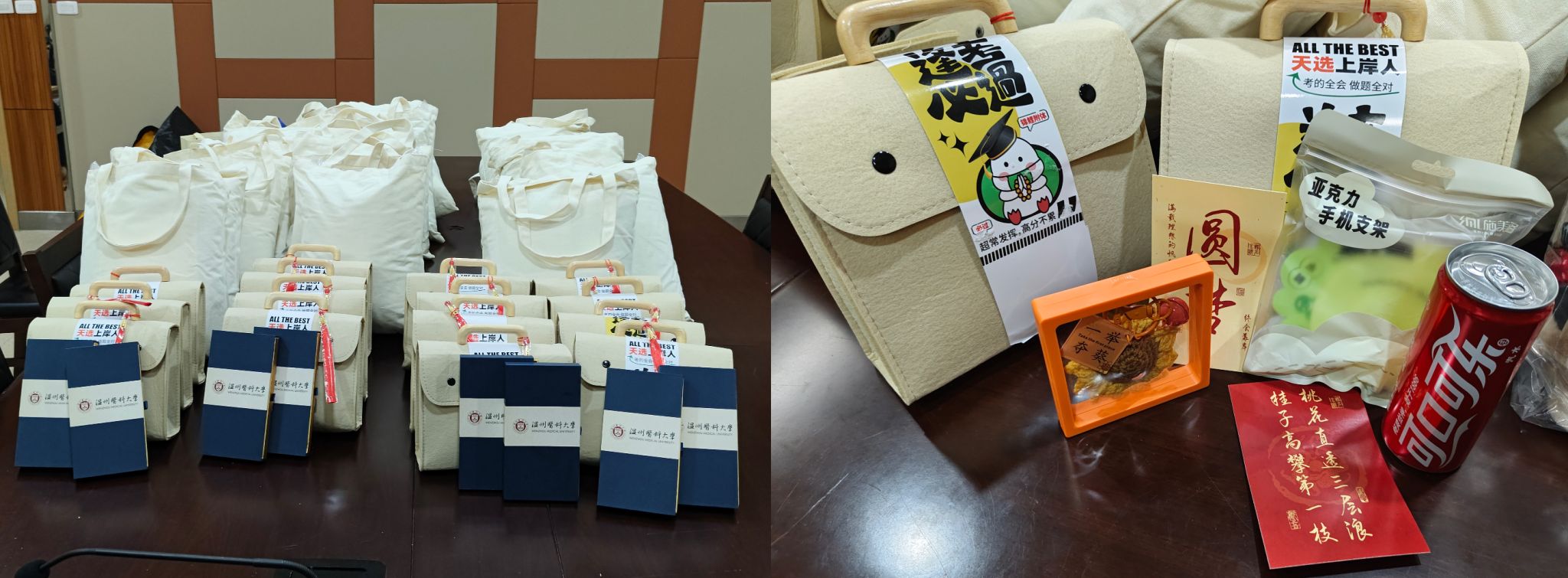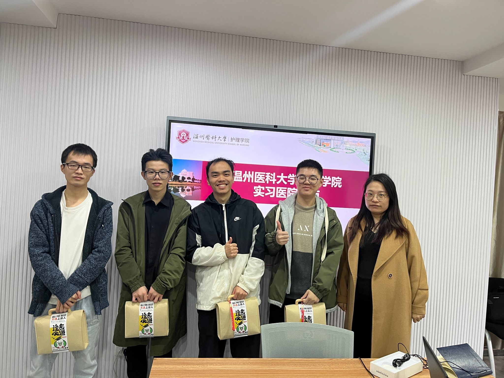 在考研冲刺的关键阶段,为深入了解成人导航 考研学子的备考情况,送上学院的温暖关怀。近日,成人导航 2025届辅导员张迪、李飞跃和张颖走访了温州市区实习点,为实习期间努力备考的同学们送去了精心准备的考研大礼包,每一件礼品都蕴含着美好寓意。象征着“一举夺魁”的针织葵花,愿同学们在考研的战场上勇夺佳绩。象征着“青松上岸”的手机支架,希望能够缓解同学们备考时的疲惫,保持最佳状态。同时,贺卡上写满了考研祝福语,愿同学们在考研的路上,每一步都坚定而有力...