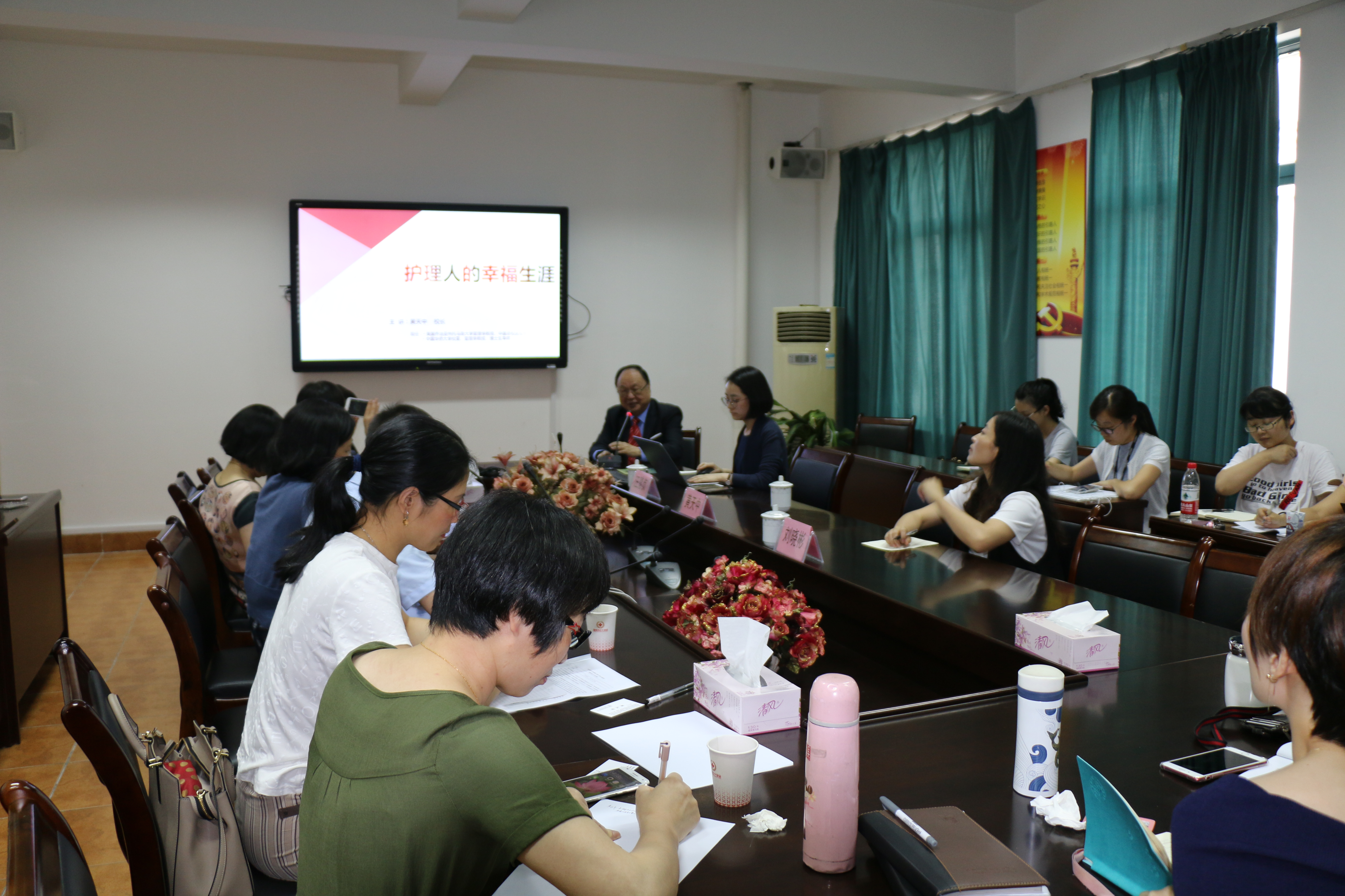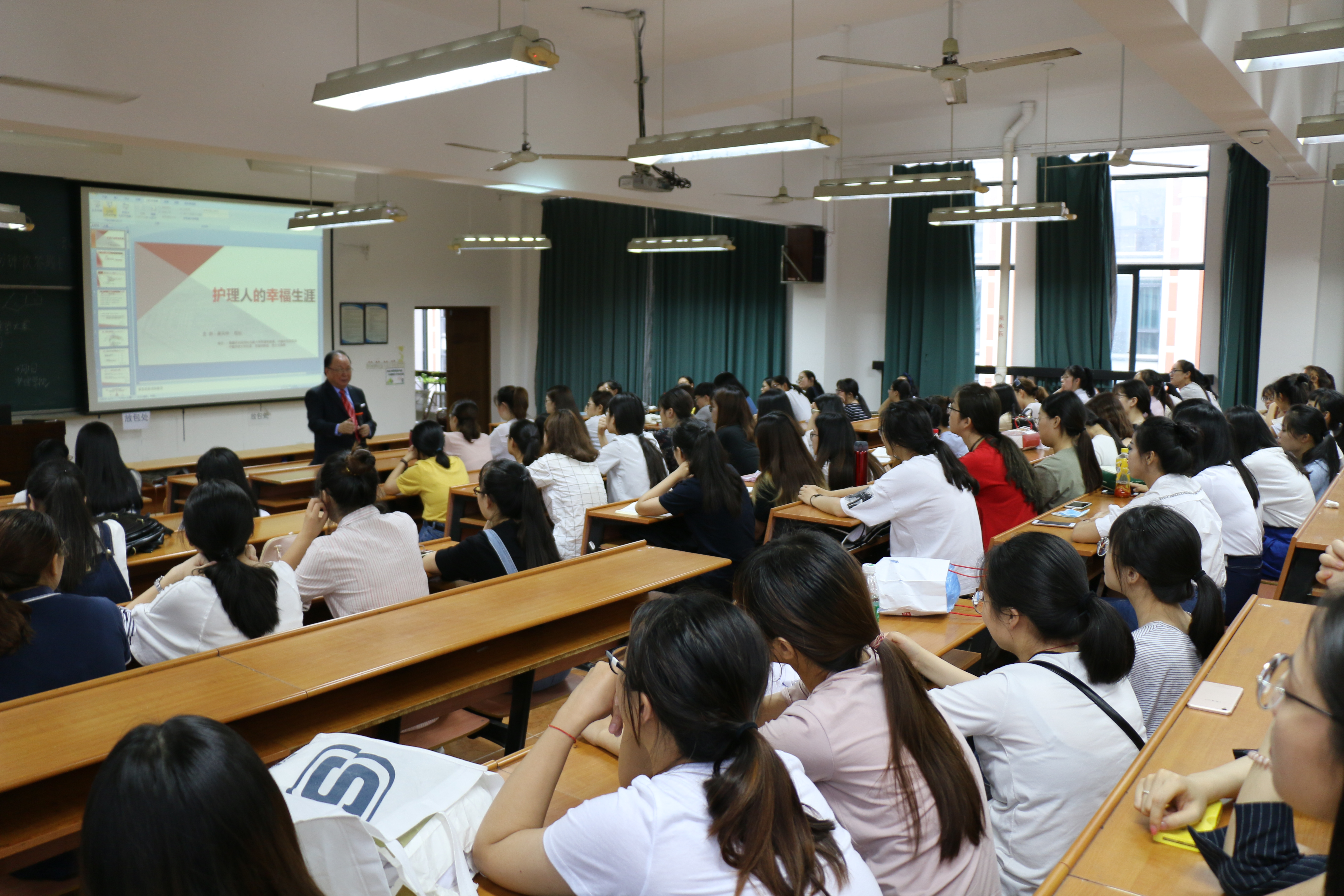 6月1日,美国托马斯大学中国总校区校长黄天中一行3人来访成人导航 ,为学院教师和学生分别进行了“护理人的幸福生涯”专题讲座。