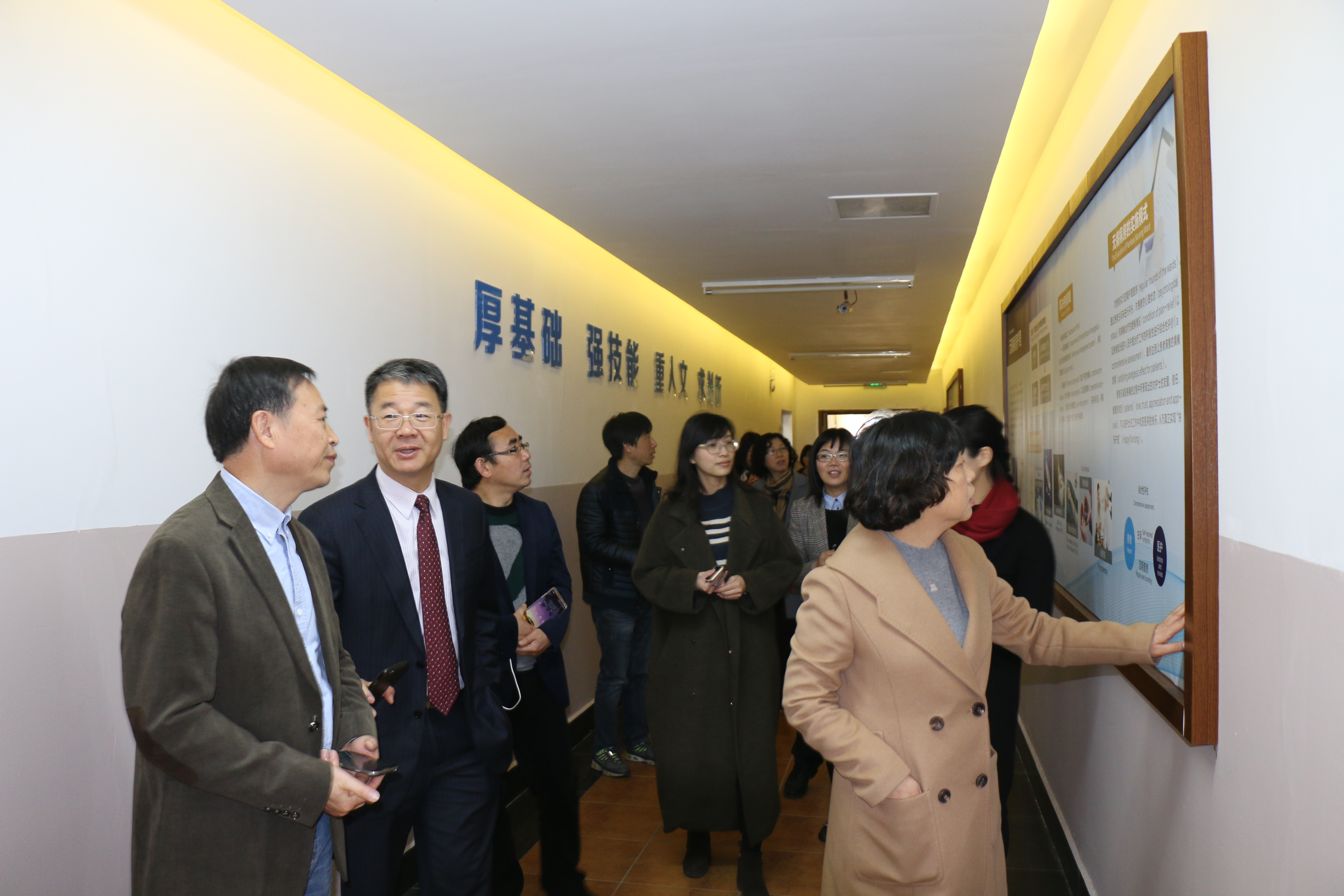 王伟杰一行在卢中秋、杨晔琴、涂艳玲等的陪同下,参观了学院文化长廊和实验室等处。随后,在7C306会议室召开的座谈会上,卢中秋代表学院热情欢迎客人们的到来,并向客人们介绍了学校和学院情况,重点介绍了学院护理学专业认证工作情况。王伟杰一行和成人导航 与会的领导及各办公室、教研室老师进行了深入的交流。
