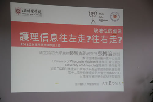 首先姜院长向客人们简单介绍了成人导航 的情况,之后台湾阳明大学张博论教授就他研究的护理资讯跟大家做了进一步的交流。张博论教授,美国威斯康辛大学工业工程博士,曾被美国医学资讯学会选为代表性人物,美国医学资讯学会是当今国际上生物医学资讯领域最具代表性的学术组织,近年来他积极从事两岸与国际护理资讯专业的连结活动,带动国内护理资讯的发展。