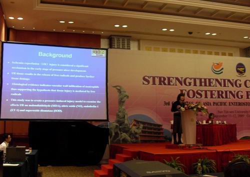 2009年12月11日——12日成人导航 姜丽萍院长、学院教师及研究生一行四人赴广州参加第三届亚太地区造口治疗师协会学术会议,大会共有来自亚太地区及美国等多国代表共500余人参加。姜院长作为国内第5个造口治疗师学校校长应邀作为大会的主席团成员。此次会议共收录成人导航 4篇学术论文做大会交流,其中姜丽萍院长的论文“Ischmia-reperfusion injury on early stage of pressure ulcer: a skin model in rats”做大会专题演讲。