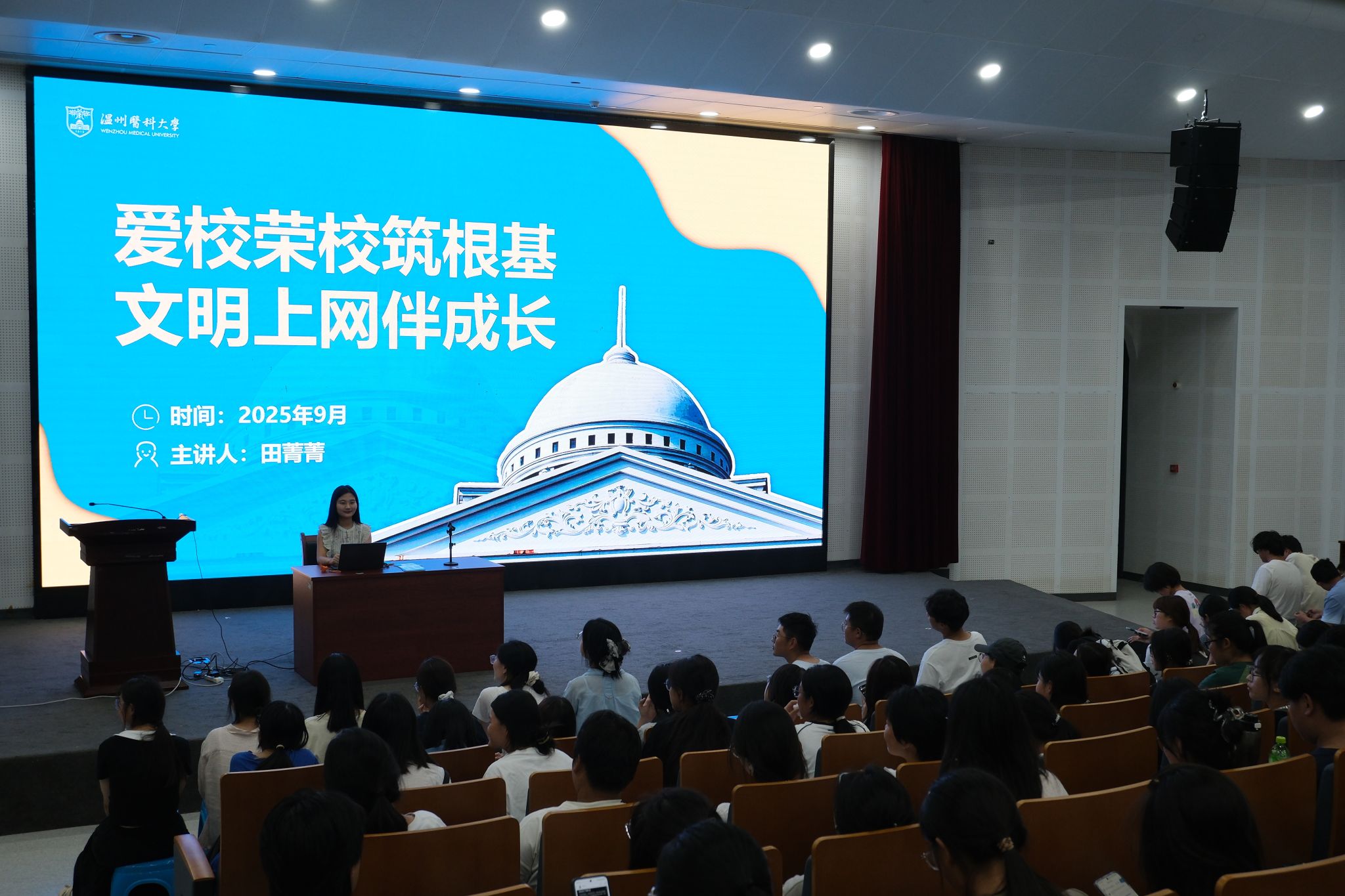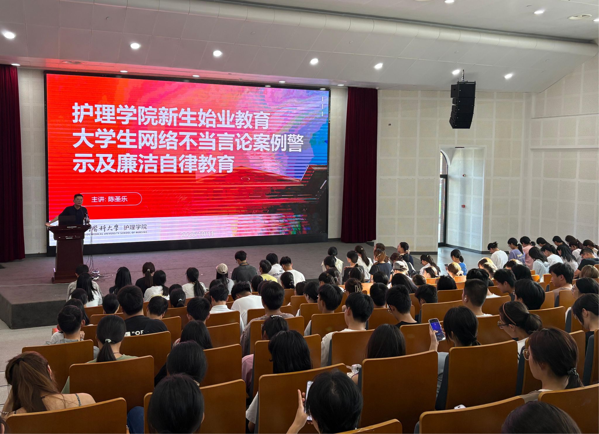 为帮助 2025 级新生提升网络行为素养、树立廉洁自律意识,成人导航 陈圣乐老师围绕大学生网络不当言论案例警示及护生廉洁品格培育展开,引导同学们规范网络行为、践行医学生廉洁自律要求,在勤学笃行中成长为有责任、有担当的新时代青年。