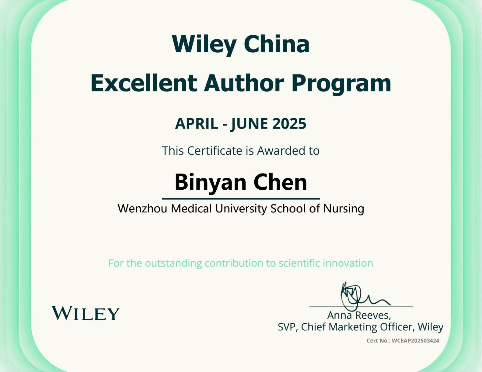 近日,国际知名出版集团Wiley正式公布“2025年第二季度威立Wiley中国高贡献作者奖”评选结果。由成人导航 2024级护理研究生陈彬艳、周敬皓、陈盛樟为并列第一作者,蔡福满教授和黄盼博士为共同通讯作者发表于期刊《Journal of Clinical Nursing》中的论文“Interpretable Machine Learning Prediction Model for Predicting Mortality Risk of ICU Patients With Pressure Ulcers Based on the Braden Scale: A Clinical Study Based on MIMIC‐IV”,在发表后立即受到了全球学者们的广泛关注,三个月内获得了334次下载,在该期刊2025年第二季度发表文章中位列前茅,因此荣获2025年第二季度“Wiley威立中国高贡献作者奖”,展现出该研究广泛的国际学术影响力。