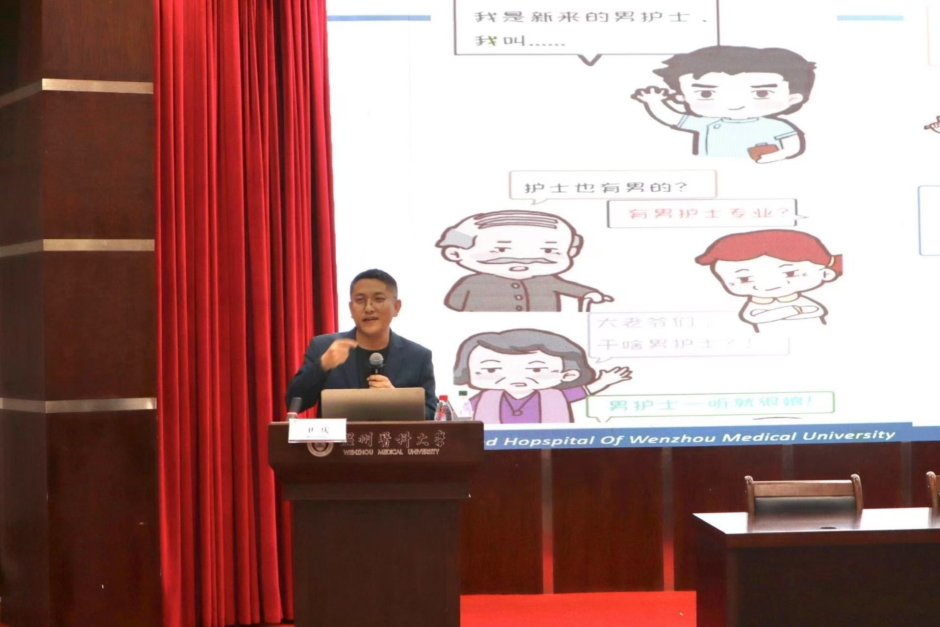 接着,卫庆老师结合全国男护士发展论坛经历,分享男护榜样的成长成就,叮嘱学子重视科研创新与跨学科学习,为其明确学习与成长方向。此外,他还结合行业数据及温医大附一岗位案例,展现男护士职业潜力,增强学子信心。分享尾声,卫庆老师回顾自己抗疫坚守经历,鼓励学子在实践中成长。
