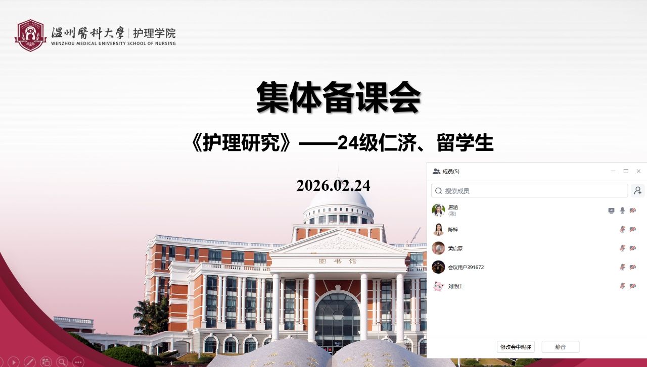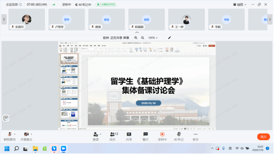 留学生《基础护理学》课程集体备课针对教材、师资、课程设计、医院见习、考核方案等议题展开深入讨论,确保留学生实践教学与理论教学无缝衔接。留学生《护理研究》课程集体备课重点围绕考核形式、实验课案例、跨文化护理理念等课程思政元素进行研讨,推动国际化教学与价值引领同向同行。