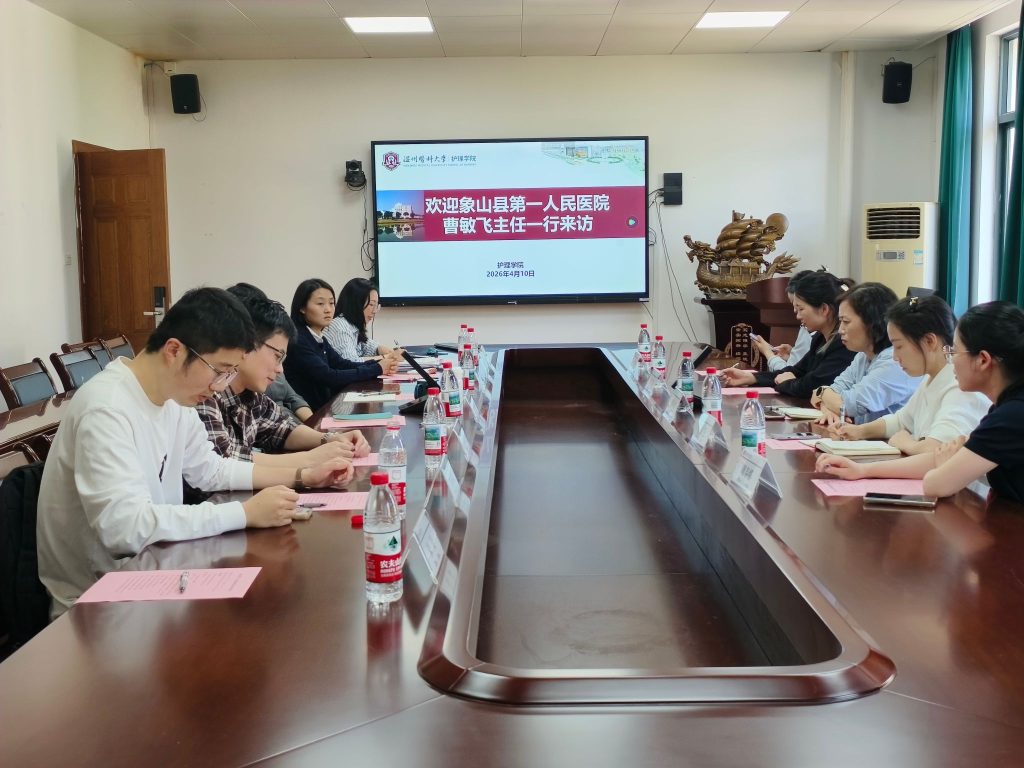 2026年4月10日下午,象山县第一人民医院护理管理中心主任曹敏飞一行来院访问交流。成人导航 院长蔡福满、副院长董超群、专任教师代表及教学办公室相关老师参会,双方围绕学院建设、学科发展与科研创新等核心内容深入研讨。