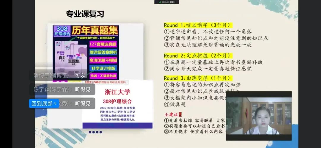 王婧学姐从如何处理实习和考研的关系出发,并介绍了报考流程,主要包括考生常见问题和填写报名信息应注意的问题。此外,学姐重点介绍了天津医科大学考研专业、招生和复习方法,并解答了同学们关心的跨考、就业方向和学校选择等方面的问题。最后,学姐还强调了临近考试要关注当地疫情政策,可以通过申请借考免去隔离带来的不便。