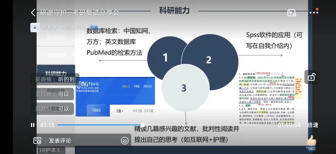 2023年3月19日下午,成人导航 就业指导服务中心举办了“研途守护”线上考研复试分享会,邀请了考入浙江中医药大学的姚佳盈学姐、安徽中医药大学的龚心玥学姐和成人导航 的傅莹洁学姐,为同学们进行考研复试专场经验分享。