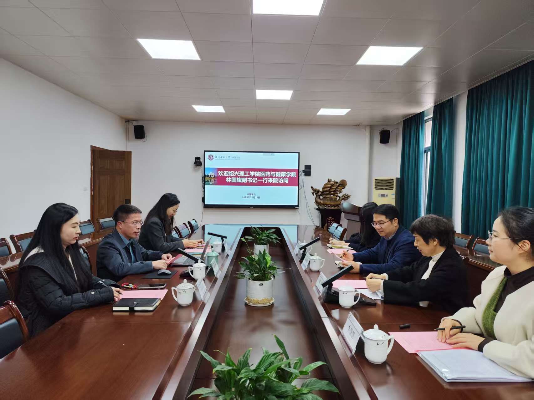 为加强校际交流与合作,促进护理学科高质量发展,12月19日下午,绍兴理工学院医药与健康学院党委副书记林国旗、特聘院长周瑾一行到学院访问交流。学院院长蔡福满、党委副书记金晓童及学工办主任张婧婧出席座谈会。