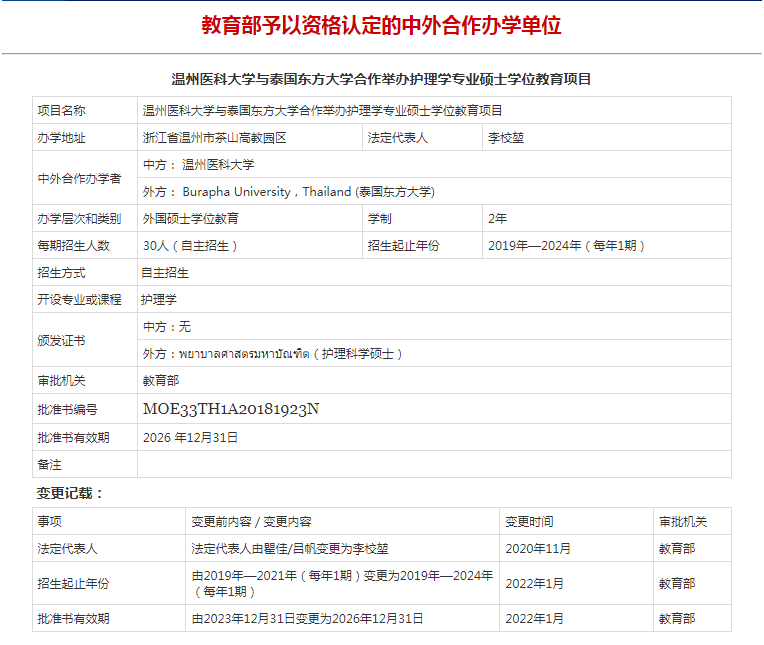 成人导航 与泰国东方大学合作举办护理学专业硕士学位教育项目于2018年经中国教育部正式批准(//www.crs.jsj.edu.cn/aproval/detail/2494),主要实施护理专业护理科学硕士学位教育。该项目为自主招生,学制2年。项目于2019年开始招生,为优秀的护理人才提供在国内接受国外大学优质教育机会。